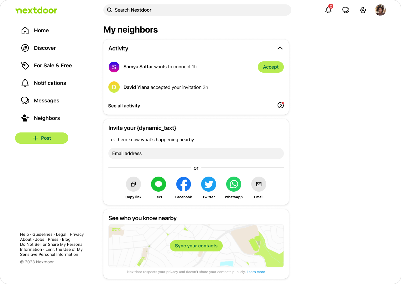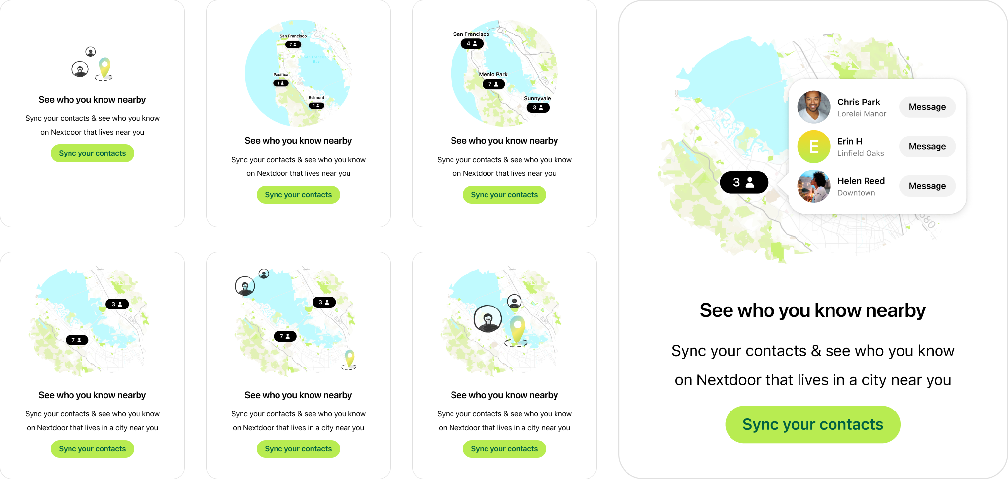 In 2023, I joined Nextdoor, a public company in the consumer social space with over 40 million weekly active users. During my time there, I worked with multiple teams on various high-impact growth initiatives, driving metric all across the funnel. From new user acquisition, to retention (WAU), and all the way down to referrals in the form of digital invites. In this case study, I'll share a bit about how my team and I focused on value first to drive growth by designing and building a feature called the Contact Map.