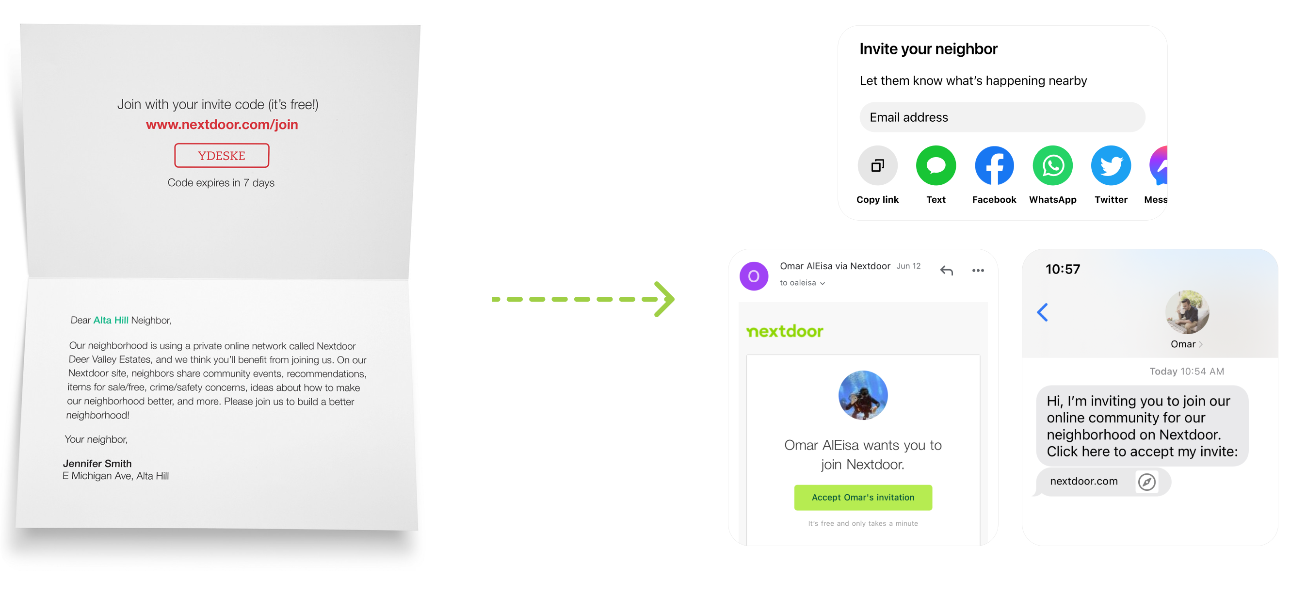 Historically, Nextdoor relied on postcard invites sent by mail as one of the main growth levers. It worked really well. However, it was costly. A little before I joined Nextdoor, the company decided to pull investment from postcards into other initiatives like digital invites.