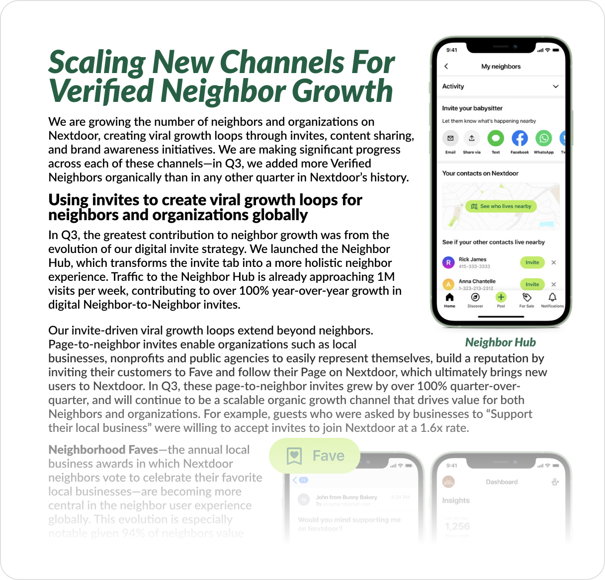 The results were extremely positive. We saw an increase in all the success metrics: contact syncs, digital invites sent, and user growth from digital invites. In addition, there was strong qualitative positive feedback internally and externally; users loved it, and I was often told by some of my co-workers at Nextdoor that this is their favorite feature! It was even called out in the company shareholder letter of Q3 2023.