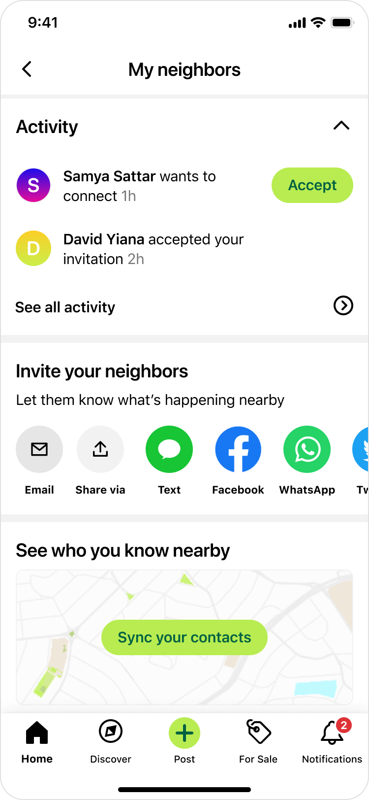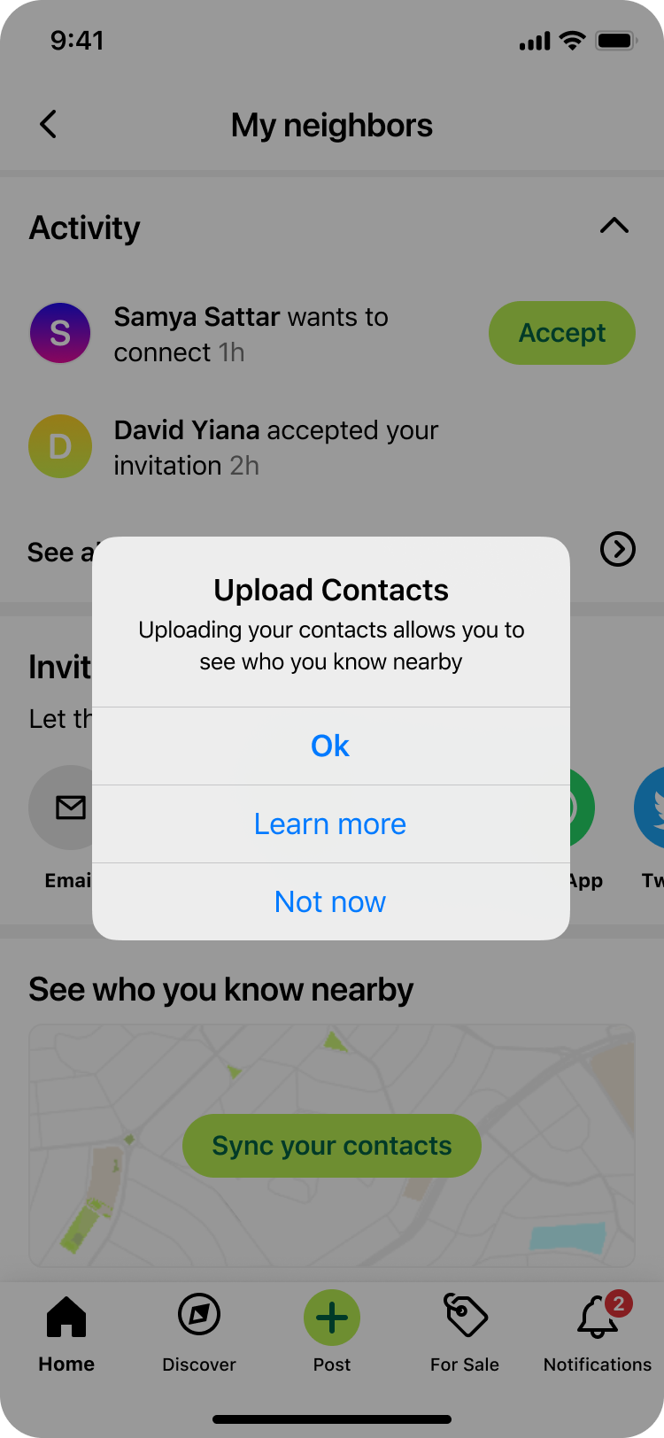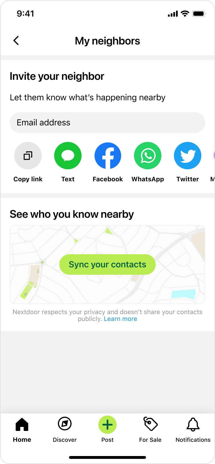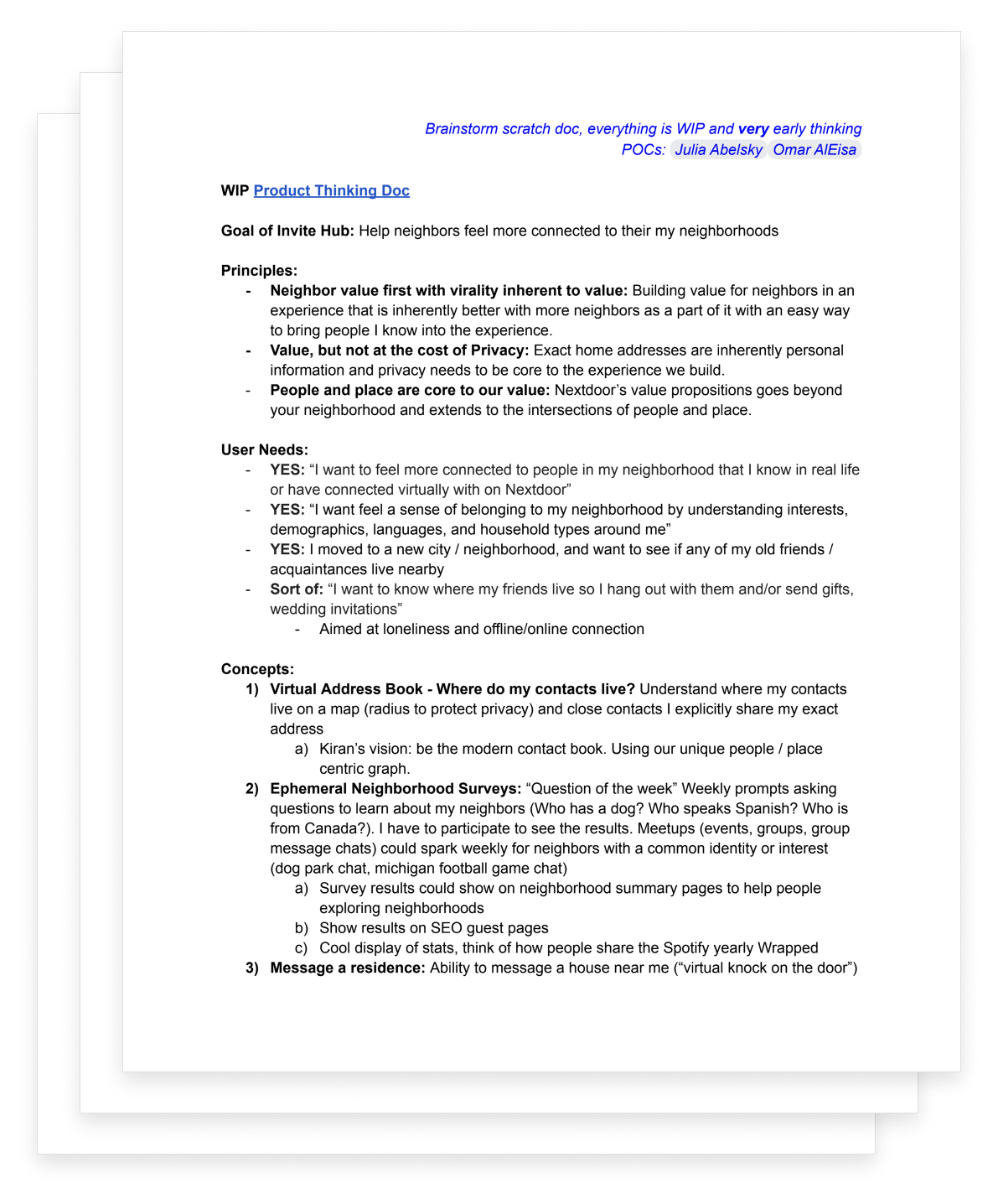 In 2023, I joined Nextdoor, a public company in the consumer social space with over 40 million weekly active users. During my time there, I worked with multiple teams on various high-impact growth initiatives, driving metric all across the funnel. From new user acquisition, to retention (WAU), and all the way down to referrals in the form of digital invites. In this case study, I'll share a bit about how my team and I focused on value first to drive growth by designing and building a feature called the Contact Map.